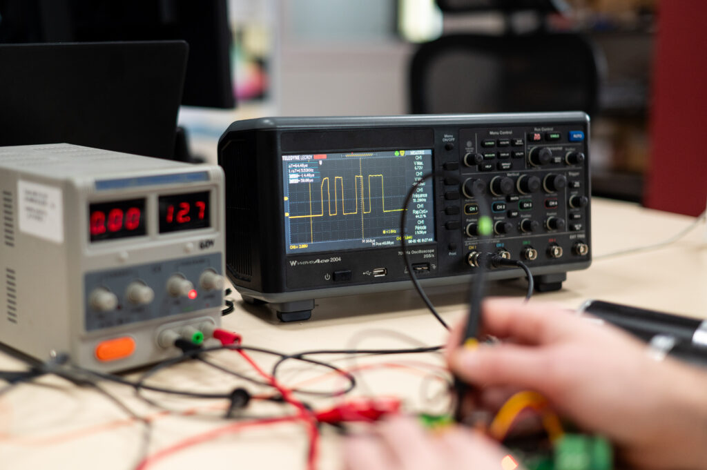 Une fois le prototype électronique assemblé, les ingénieurs procèdent à une série de tests destinés à vérifier le bon fonctionnement du système. Cette phase de validation technique permet d’analyser les performances du circuit et d’identifier d’éventuels ajustements.